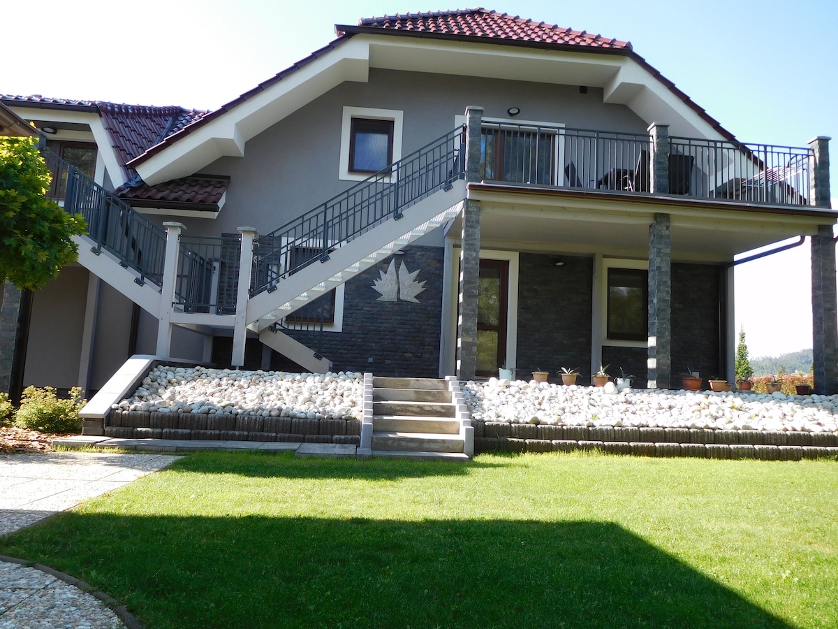 Հարմարավետ բնակարան ՝ ձմեռային այգով, որտեղից բացվում է կախարդական տեսարան դեպի պարտեզը և Բարձր Տատրասը ։ Բնակարանը գտնվում է տան առաջին հարկում: Այն ունի առանձին մուտք: Այն բաղկացած է երկու ընդարձակ ննջասենյակներից (4 մահճակալ + 1 լրացուցիչ մահճակալ )՝ TV - Sat - ով, լոգասենյակից (լվացարան, ցնցուղ, WC), լավ կահավորված խոհանոցից (գազօջախ, էլ. Ջեռոց, սառնարան, միկրոալիքային վառարան, սրճեփ, էլեկտրական թեյնիկ), ճաշասենյակ և ձմեռային այգի ՝ նստատեղերով, որտեղ կարող եք հարմարավետորեն հանգստանալ դժվարին արշավից հետո ։)