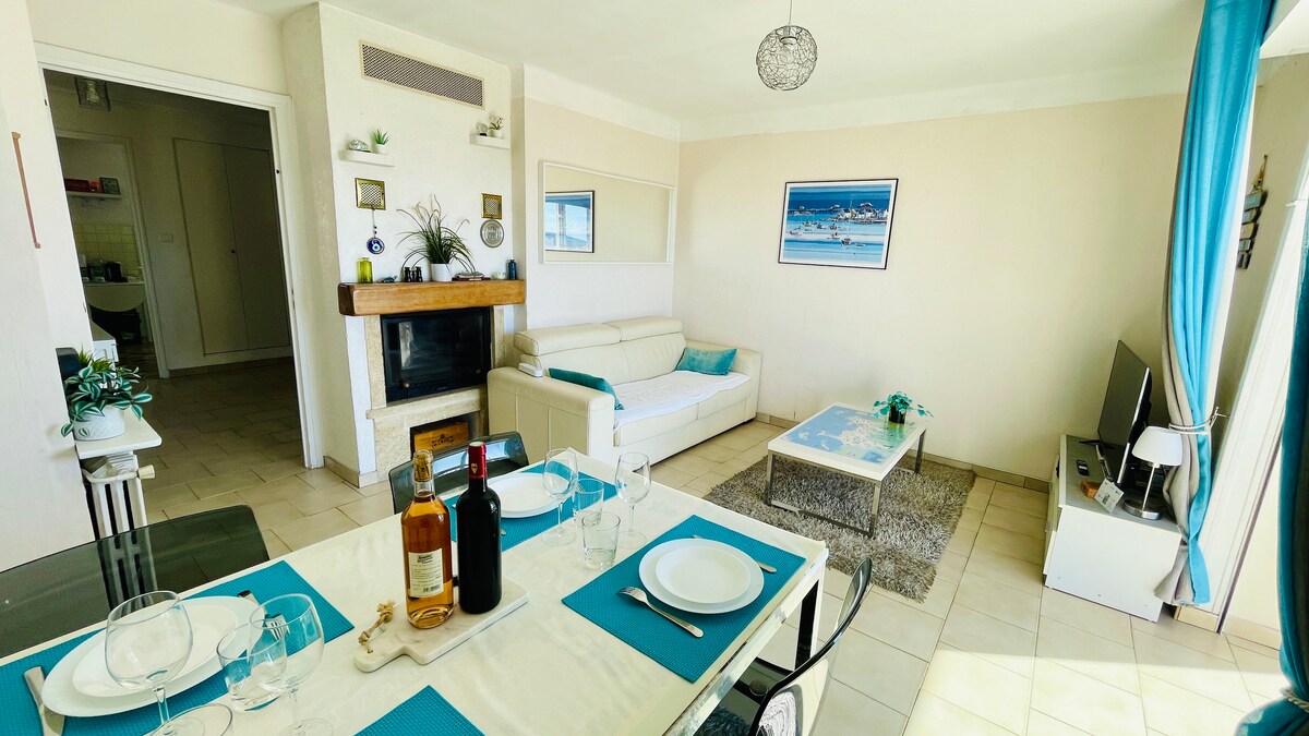 Moderne 3 pièces de 65m2, au calme absolu, vue mer exceptionnelle, wifi ultra rapide, TV UltraHD 110cm Netflix inclus. Vue mer, assis sur canapé, ou allongé sur le lit, idéal famille ou séjour en amoureux. Tout confort, canapé cuir, 3ème étage/4, ascenseur, stationnement gratuit ds la rue. Quartier le + résidentiel à 200m des superbes plages de sable/restaurants, idéal, proche commerces/transports. 5 voyageurs max. Draps/serviettes fournis (réduction possible sans me consulter).