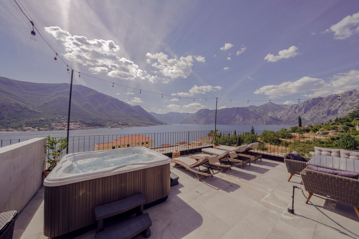 Բարի գալուստ ձեր տուն ՝ գեղեցիկ Դոբրոտայում ։ Պատմական Սուրբ Էուստասե վանքի և Կոտոր Հին քաղաքի միջև գտնվող ափամերձ գոտու անմիջապես վերևում գտնվող մեր ընդարձակ և ոճային բնակարանն առաջարկում է հարմարավետության, հմայքի և հարմարավետության կատարյալ հավասարակշռություն: