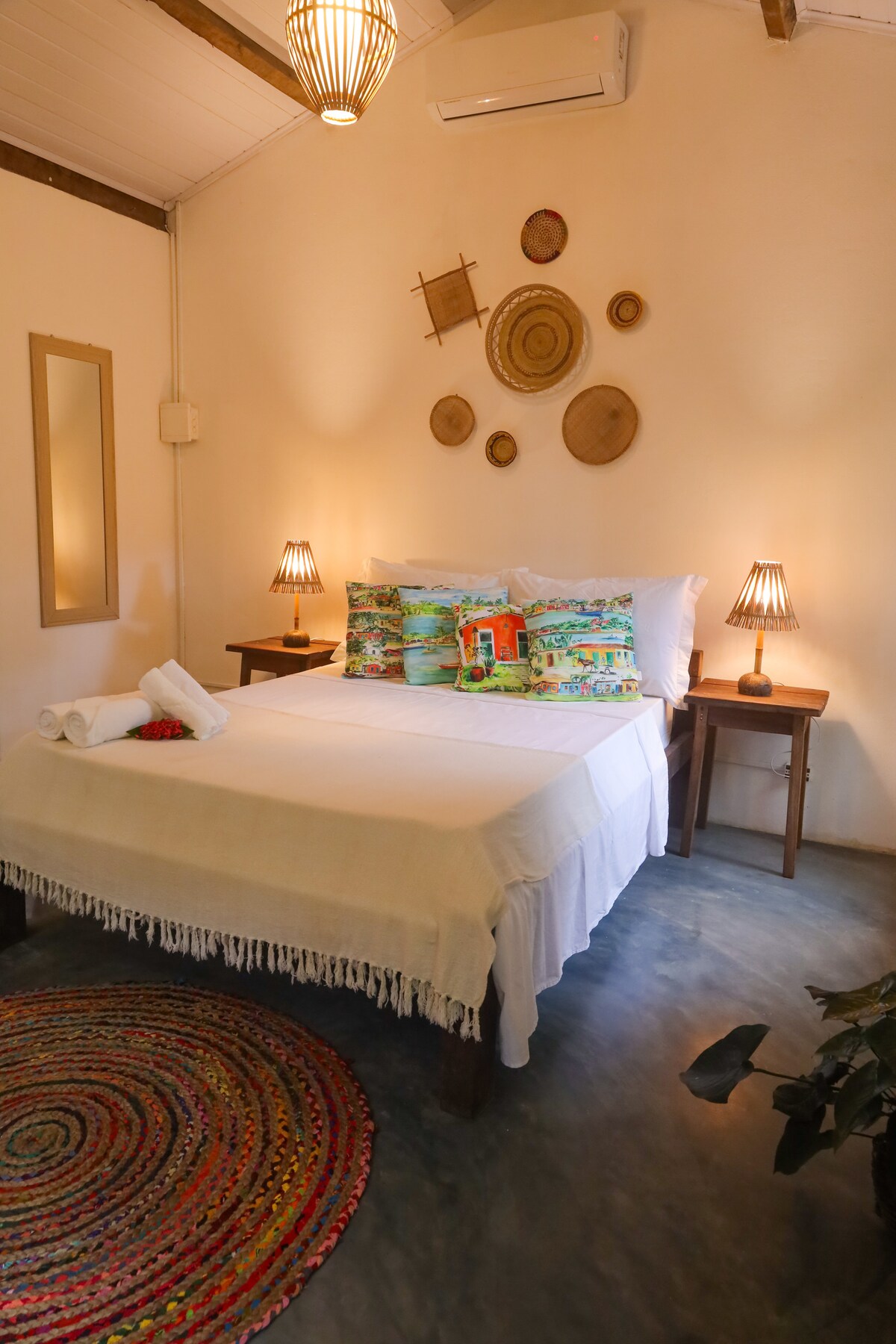 The Caju Chalet reflects the owner's love and care. Initially built as her own home, it has been transformed to warmly welcome new guests. It features a large suite, a delightful balcony with a hammock and a table for dining or a home office, and a fully equipped outdoor kitchen. The Caju Chalet boasts a spacious private garden in addition to the common area. It's ideal for two people, but if needed, we have an extra trundle bed for a third person.