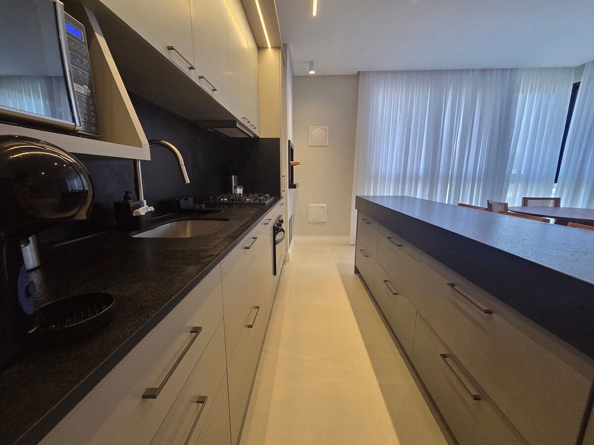 Cada detalhe do apto foi pensado para transmitir a leveza, elegância e aconchego do mar Mediterrâneo. Tons suaves, texturas naturais e iluminação planejada criam o ambiente ideal para dias inesquecíveis. 2 suítes, com ar condicionado e TV 4K. Sala de jantar e estar com TV 65". Cozinha equipada para jantares memoráveis. Sacada gourmet com churrasqueira e vista para o mar. No Rooftop, Piscinas aquecidas, perfeitas para banhos relaxantes até mesmo no inverno e academia totalmente equipada.
