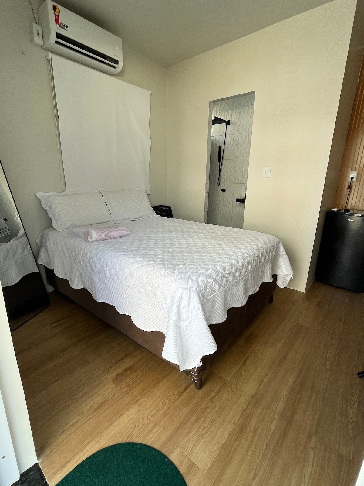 A acomodação está localizada em uma esquina, o que garante boa ventilação natural. Por estar em rua movimentada, podem ocorrer ruídos externos, como trânsito e circulação de pessoas. Não é indicada para hóspedes que buscam silêncio absoluto. O espaço é novo e está em fase final de ajustes, podendo ainda haver pequenos detalhes de acabamento em andamento, como a porta do banheiro, painel, etc. Apesar disso, a suíte já está funcional e disponível para hospedagem, sem interferir no uso do quarto.