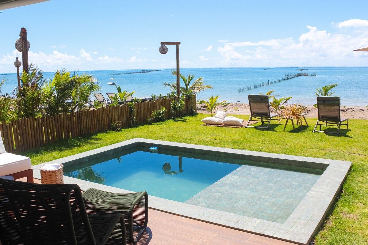Casa Koral Milagres - New beach house with 3 bedrooms in closed condominium. Front row beach view and direct access to Praia Marceneiro. Private pool and garden. The house is located in Sao Miguel dos Milagres. The house faces the sea with unobstructed view/access to the beach. From the living room you can walk into the backyard with a pool and sand and sea in front of you - 3 bedrooms and 3 full bathrooms (2 being connected) - Queen bed in each bedroom and 4 pullout beds = Beds for 10 people