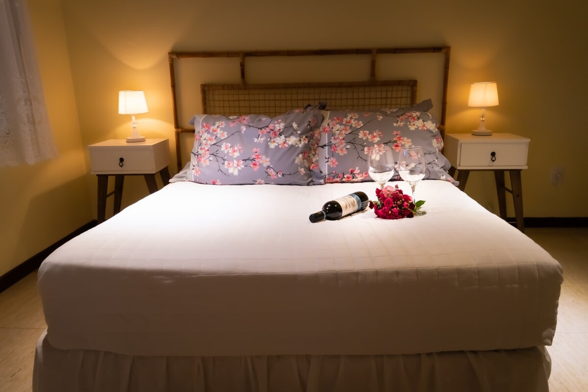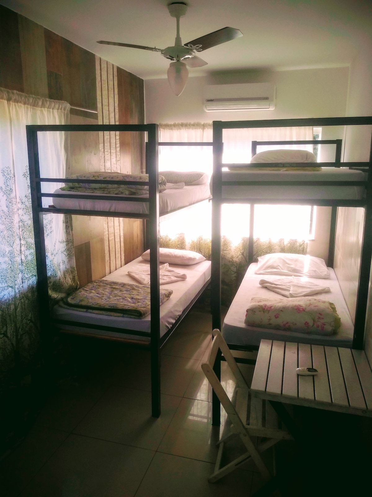Cada suíte oferece: cama de casal confortável, mesa de apoio para trabalho ou refeições, e ventilador com funcionamento contínuo para noites confortáveis e frescas.