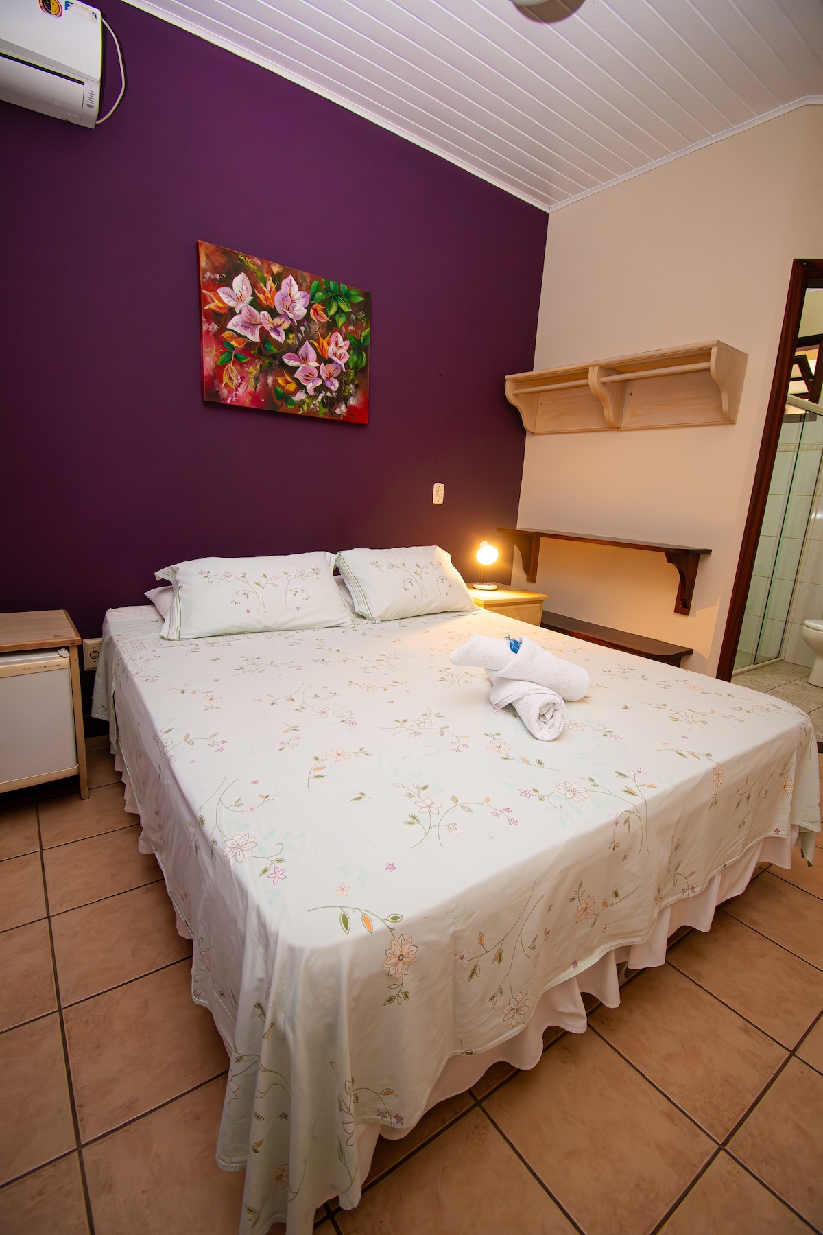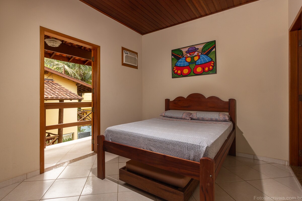 A suíte possui cama de casal com forro de elástico, uma manta fina, e travesseiros com fronhas. A suíte não possui vista direta para o mar mas você consegue ver o mar no nosso deck que fica de frente à praia. O Ar condicionado, ventilador, frigobar, TV e banheiro privativo estão disponíveis para seu conforto. Além disso, são fornecidas duas toalhas de banho. Esta suíte não fica localizada na parte próxima à praia ou deck e sim no primeiro ou segundo prédio no meio ou começo do quintal.