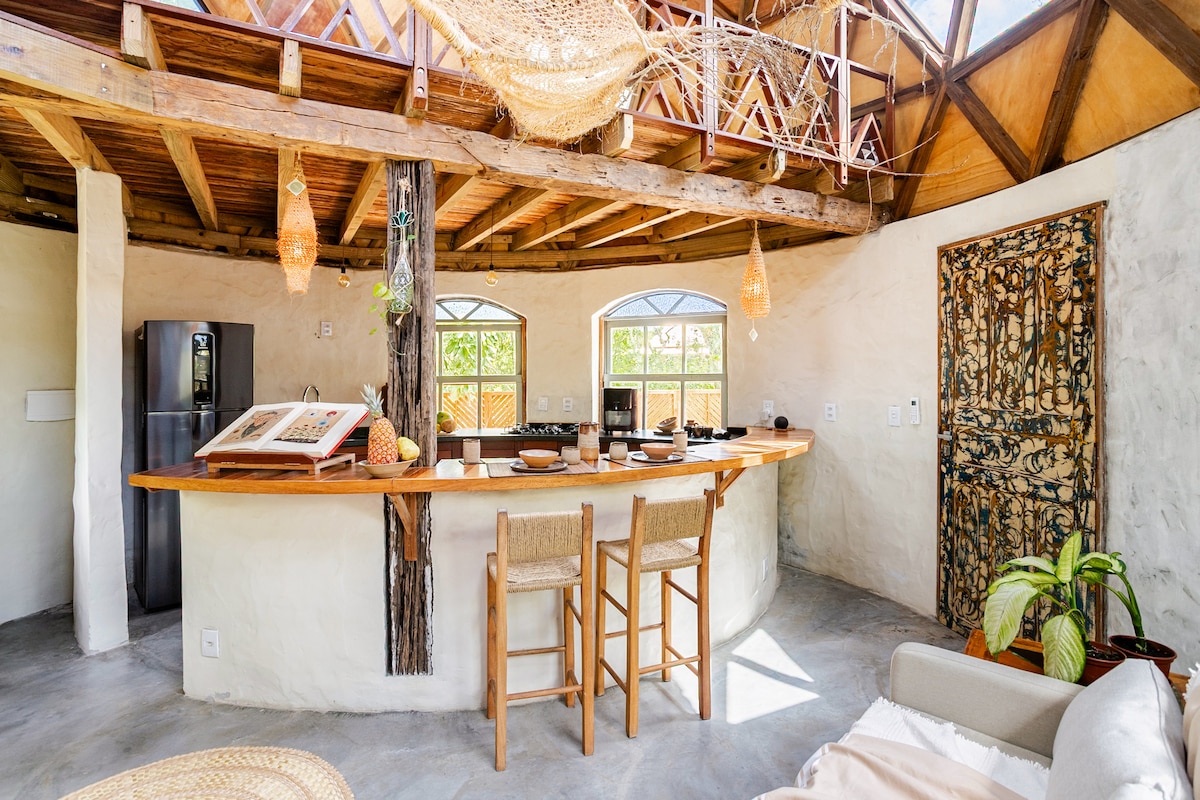 ♥ Let Nature inspire you in one of our Geodesic Domes at Recanto Pedra Maya in Garopaba. ♥ 2 queen beds + Sofa bed ★Sleeps up to 6 guests (extra fee for more than 2) ★ 10 min drive from the beach ★ 15 min from Surf Land ★ Waterfall just 3 min from the Dome ★ Spacious covered deck with horizon view ★ Fully equipped kitchen ★ Heating and air conditioning ★ Home Office space ♥ Shared outdoor areas: Natural pool, waterfall, firepit with grill, and playground.