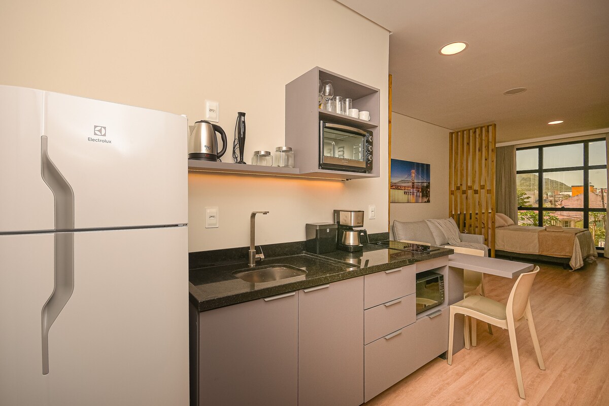 Studio novo, totalmente mobiliado e equipado, em um prédio inteligente com arquitetura única, localizado a apenas 100 metros da UFSC. Aqui você esquece as chaves: todos os acessos são por reconhecimento facial. Estrutura completa: 🚲 Bicicletário 💪 Academia 👔 Coworking/sala de reuniões 🍽 Sacada gourmet 🌿 Rooftop com gramado Viva com conforto, tecnologia e praticidade no coração de Florianópolis!