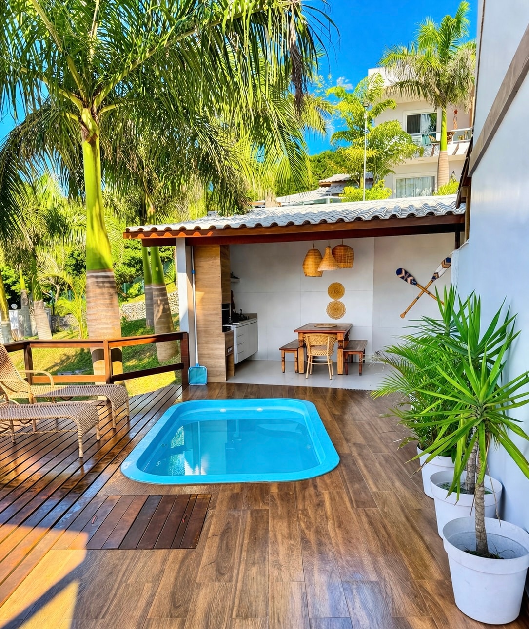 Բալիական վիլլաների ազդեցությամբ տուն ՝ գյուղական, բայց չափազանց հարմարավետ և նրբաճաշակ, ամենաբարձր ստանդարտով, կահույքով, կենցաղային տեխնիկայով, մահճակալով և լոգասենյակներով ։ Գուրմանների երազանքների տարածք ՝ գազի և փայտածխի գրիլներով, փայտով աշխատող ջեռոցով, եփուկով և ծխողով ։ Սպա ՝ ջեռուցվող 1,4 կիլոմետր լիտրով, սաունա ՝ լի հիջաու քարով ՝ անտառի համայնապատկերով ։ 5 հսկայական կտավ, որոնցից 2 - ը ՝ 75»։ Equipamentos Elettromec, Kitchen Aid, Le Creuset ։ Ինտերնետ 500 Մբ. Դրախտ սննդի սիրահարների համար
