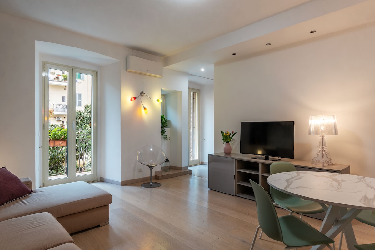 L’appartamento è situato nella centralissima zona “Prati” ed è composto da una grande cucina ben attrezzata, da un soggiorno dove si trova un comodo divano letto ad una piazza e mezzo, da una camera con letto matrimoniale e da un grande bagno. A beautiful apartment perfectly situated in the very heart of Rome. Comfy living room with a sofa bed, fully-equipped kitchen, double bedroom, large bathroom.
