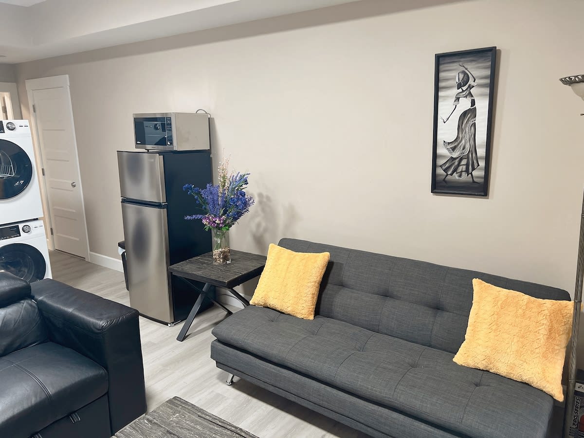 Ժամանակակից մեկ ննջասենյակով վերգետնյա մուտքի նկուղային առանձնաբաժին ՝ ընդարձակ հյուրասենյակով, համալսարանին մոտ գտնվող նոր ենթաբաժնում ։ Հարմար է 2 մեծահասակ հյուրերի համար ։ Գտնվում է ավտոբուսի կանգառին մոտ և դեպի Walmart, Costco և Superstore մեքենայով մի քանի րոպեի ընթացքում ։ Առանձին մուտք ՝ առանձին լվացքատունով ։ Խոհանոցը հագեցած է չժանգոտվող պողպատից սպասքով և եփուկով ։ 55 դյույմանոց հարթ էկրանով սմարթ հեռուստացույցով կարելի է վայելել Telus Optik հեռուստացույցը և Netflix - ը ։ Փողոցում անվճար կայանատեղ ՝ մեկ տրանսպորտային միջոցի համար ։