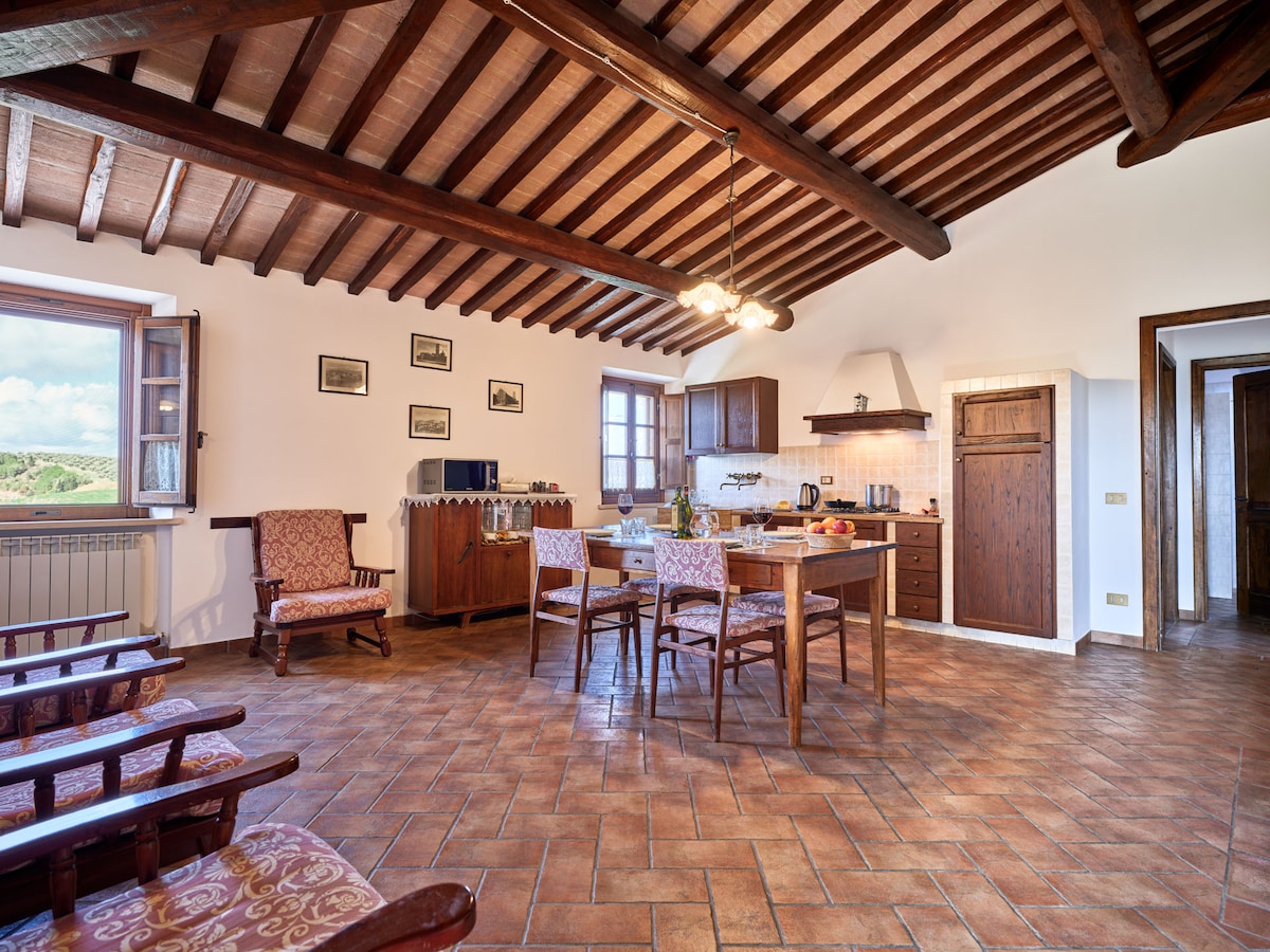 Տոսկանական ագարակում գտնվող գյուղական շենքում գտնվող հողատարածքին մոտ զգացեք տարածքը ։ Հին քարե պատերը, ճառագայթներով և տեռակոտե հատակով առաստաղները բուխարիով բնորոշ բնակարանի ֆոնի վրա են ։ Սուզվեք անծայրածիր լողավազանի մեջ, որտեղից բացվում է շրջակա բնապատկերը ։ Ճաշեք դրսում, մաքուր օդը շոյելով ձեզ, նստեք և հանգստացեք ՝ հիանալով հին նոճիի տակ գտնվող մայրամուտով ։