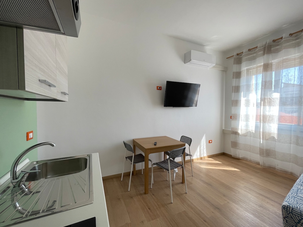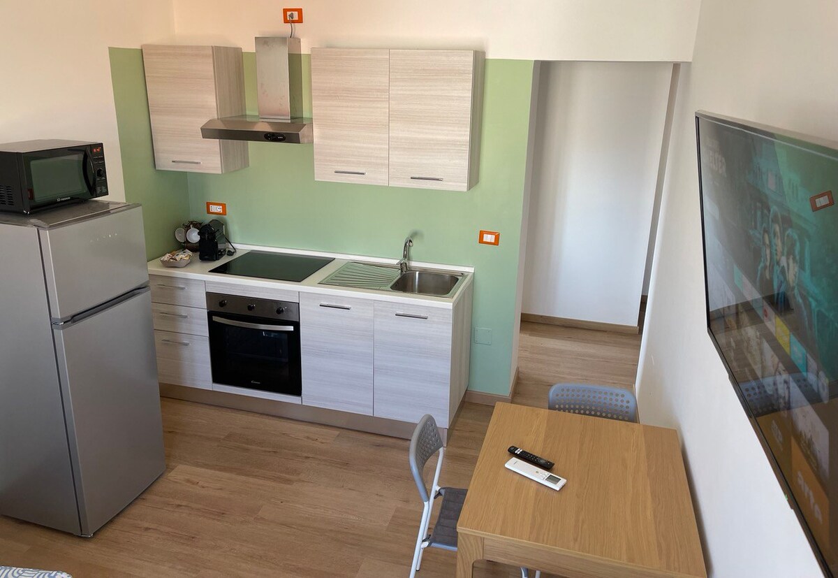Նոր և հեղինակավոր բնակարան, անկախ մուտք մասնավոր բակի հետ Տերմոլիի կենտրոնում։ - Բնակարանը բաղկացած է 1 ընդարձակ սենյակից՝ բակի տեսարանով, 1 լոգասենյակից՝ ցնցուղով և պատուհանով, 1 խոհանոցից՝ բոլոր հարմարություններով և 1 հյուրասենյակից՝ բազմոցով։ - Գտնվում է ռազմավարական դիրքում՝ երկաթուղային կայարանին, գլխավոր փողոցին և ծովին մոտ։ - Ժամանակակից ոճի կահավորանք ՝ արդյունավետության համար ։ - Բնակարանը գտնվում է քաղաքի գլխավոր փողոցներից մեկում՝ Վիա Ջ. Պեպե, 38։