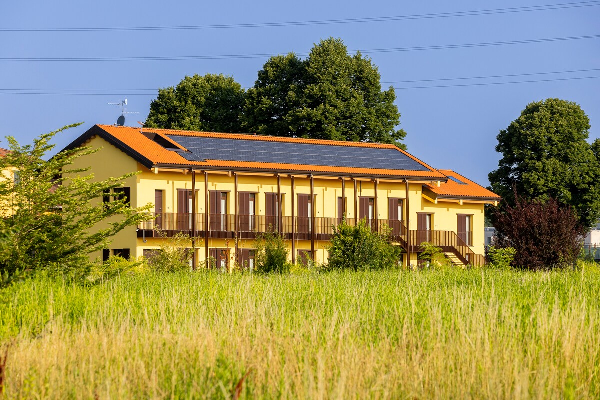 Grow Green vi accoglie in Cascina Turro, storica cascina lombarda rinnovata da un progetto di famiglia. Un luogo in cui ospitalità e comfort si coniugano con sostenibilità e rispetto per l’ambiente, un modello di ospitalità moderno e green. L’Ambiente 9 è una soluzione spaziosa e versatile, ideale anche per chi cerca un ambiente che integri relax e lavoro o soggiorni lunghi. Da soli, in coppia, fino a quattro persone.