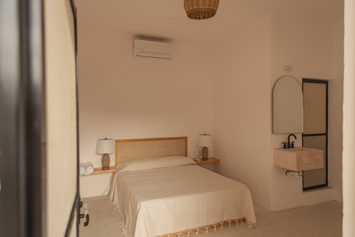 Ընդարձակ երկհարկանի վիլլա և առանձին լոգարան, որպեսզի կարողանաք հանգստանալ լավագույն ձևով ։ Այն ունի լիարժեք խոհանոց, հյուրասենյակ և ամբողջական լոգասենյակ ՝ գյուղական ոճով, որն ուղեկցվում է լավագույն ավարտներով և նյութերով ։ Այն ունի երկտեղանի մահճակալ, յուրօրինակ դիզայնով կահույք և 100% մեքսիկական դեկոր, փոքրիկ պահարան և ցանցաճոճով տեռաս ՝ լավագույն հարմարավետությունը վայելելու համար ։ *Նկարները ներկայացուցչական են և կարող են փոխվել