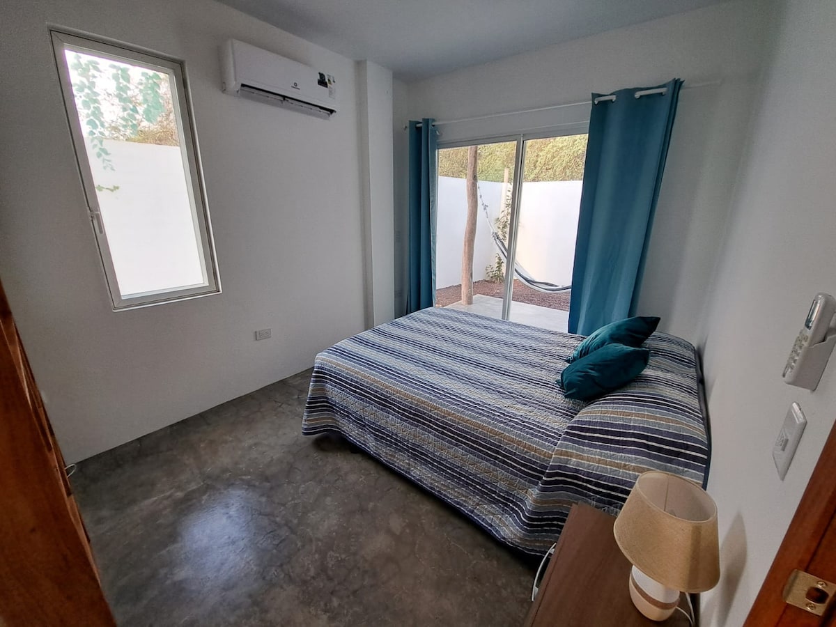 Հարմարավետ ծովային ոճի բնակարան Պուերտո Այորայի սրտում, Գալապագոս ։ Ոտքով ընդամենը մի քանի րոպե հեռավորության վրա դուք կգտնեք մալեկոնը ՝ մուտք գործելու այն լաստանավերը, որոնք ձեզ տանում են այլ կղզիներ, ինչպես նաև տուրիստական գործակալություններ, բանկոմատներ, ռեստորաններ, լվացքատուն և սուվենիրներ: Այս տարածքն ունի լուսավոր հյուրասենյակ, կահավորված խոհանոց և հարմարավետ սենյակներ ։ Այն առաջարկում է Starlink ինտերնետ, տաք ջուր, օդորակիչ ։ Կատարյալ է բնության գրկում արկածներից հետո հանգստանալու համար ։