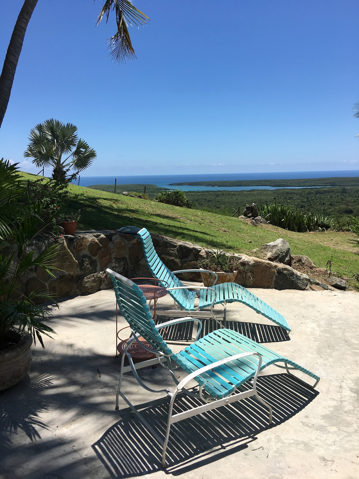 Private, spacious and light-filled 2 bdrm apartment w/ 10-foot ceilings on top of a quiet hill. 3min. from beach and 5 min. from the main town of Isabel Segunda. This property was designed for the view! Every day you will be able to see the island, ocean, and the famous Vieques sunset from your private deck or the pool. Beach gear, one snorkel set, and inflatable paddleboard included. Lg bdrms with comfortable queen beds + pullout coach. Full kitchen+bbq grill.