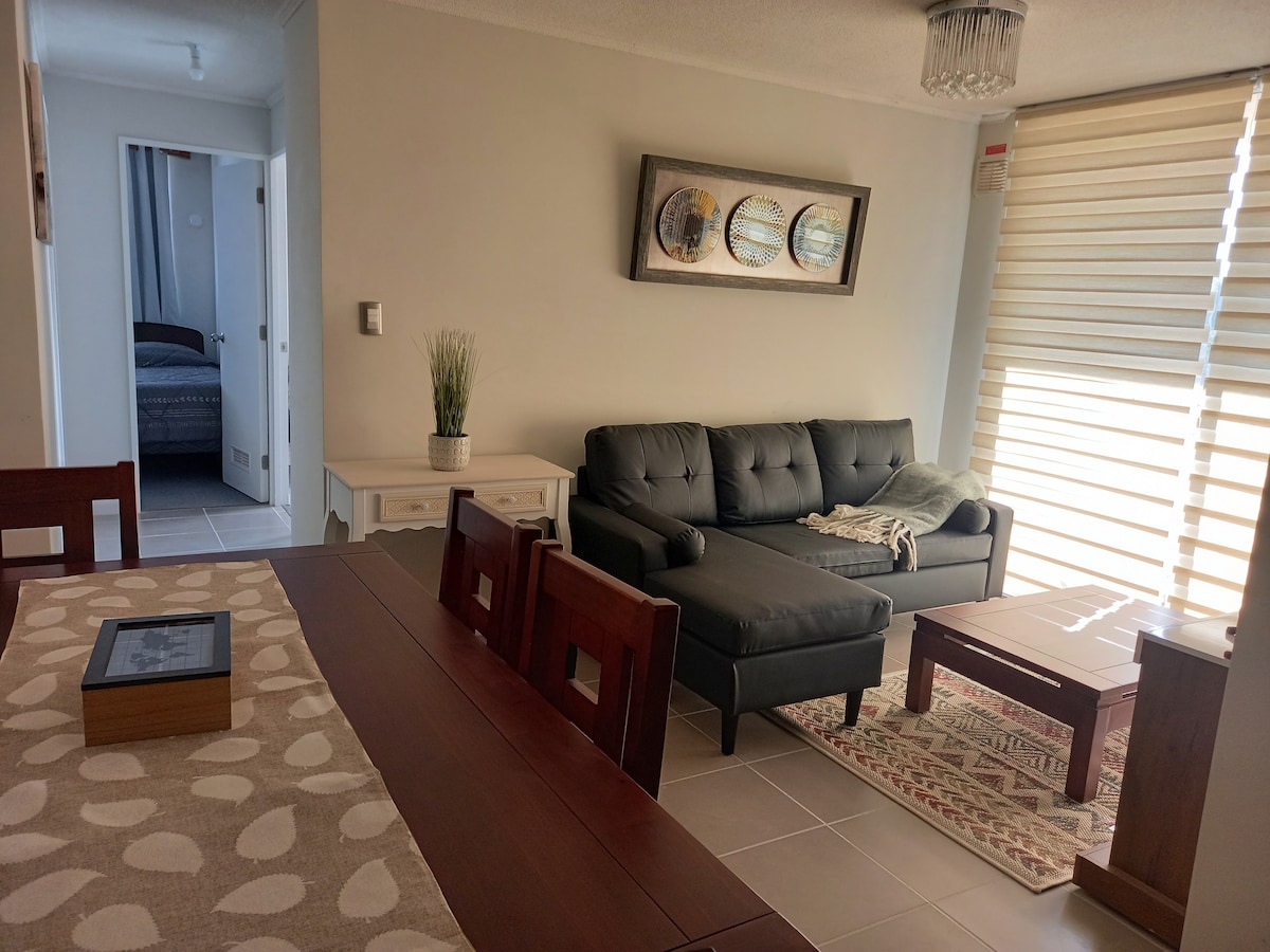Հարմարավետ բնակարան Օվալեի կենտրոնի մոտ ։ Իդեալական է, որպեսզի ձեզ զգաք ինչպես տանը, երբ դուրս եք գալիս ։ Այն ունի 3 ննջասենյակ, 2 - ը ՝ 1 - ից երկու մահճակալով, իսկ երրորդը ՝ մահճակալով ։ Երկու ընդարձակ պահարան ՝ ժամանելուն պես ձեզ տեղավորելու համար ։ Մենք ունենք լիովին կահավորված խոհանոց և լոջա ։ Նաև Wi - Fi կապով և կաբելային հեռուստատեսությամբ ։ Այն գտնվում է երրորդ հարկում, և դուք կարող եք անվճար օգտվել համապատասխան կայանատեղիից ։ Կոնդոմինիումն ունի շուրջօրյա անվտանգություն: