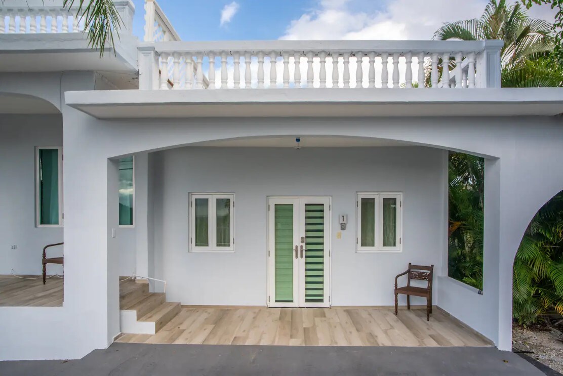 A spacious 1 bedroom ( King size) apartment on the ground level of a 2 story/2 apt. house. This apartment (Puntas Abajo) is around the back of the house facing the pool and has a private entrance. It is very quiet! 1 free parking space conveniently located in front of the house. Apt is in Puntas, Rincon central to all beaches, restaurants and everything that is rincon! Since this apartment is on the back of the house it is exceptionally quiet. Powerful AC to cool. All newly and fully furnished!