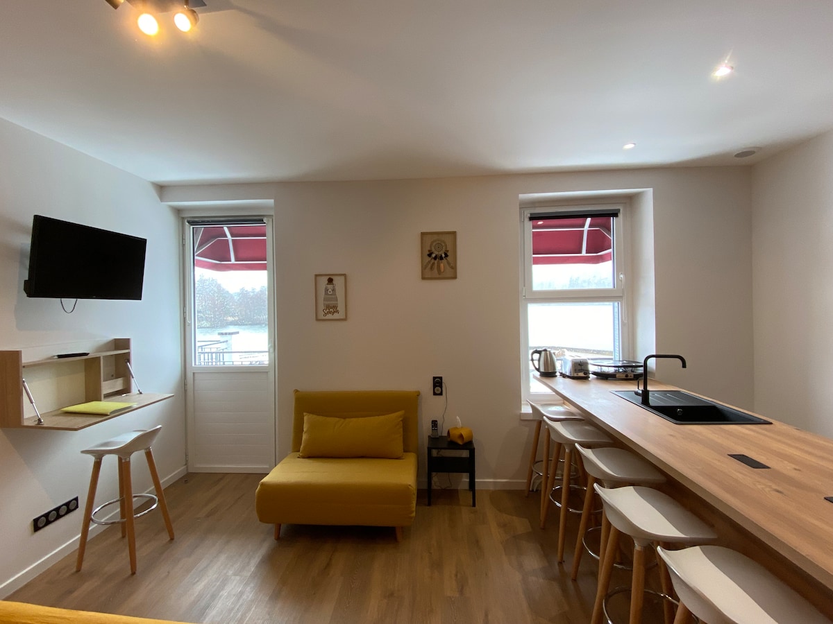 Rien n'a été laissé au hasard dans cet hébergement de charme haut de gamme. Que vous veniez seul ou accompagné de toute votre petite tribu, vous serez forcément comblé(s) par ce logement entièrement rénové durant l'hiver 2022-2023 ainsi que par la vue qu'il propose: sur le lac Chambon et le puy de Sancy depuis la chambre principale; sur le jardin de l'établissement depuis la chambre secondaire!