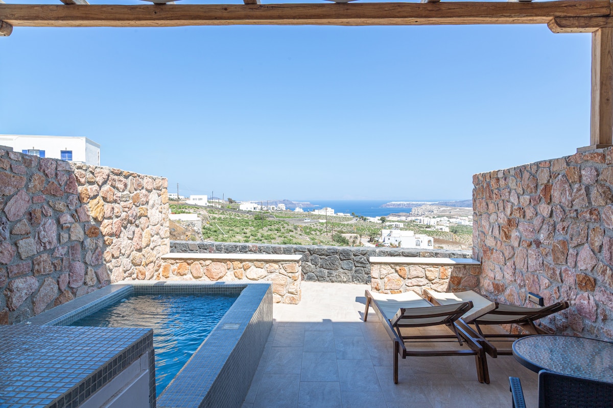 Martynou View villas is a private property,located in Santorini Pyrgos village. Just a few steps away from restaurants cafe and more shops.Only 10 minutes driving distance from central Fira and from the best beaches of the island. This is an ideal choice for couples. The property offers a spacious living room with kitchen, bathroom,double bed,air condition,coffee machine,TV,fridge,Wi-fi, soundtrack,private parking and a lovely balcony with private heated jacuzzi and stunning sea view!