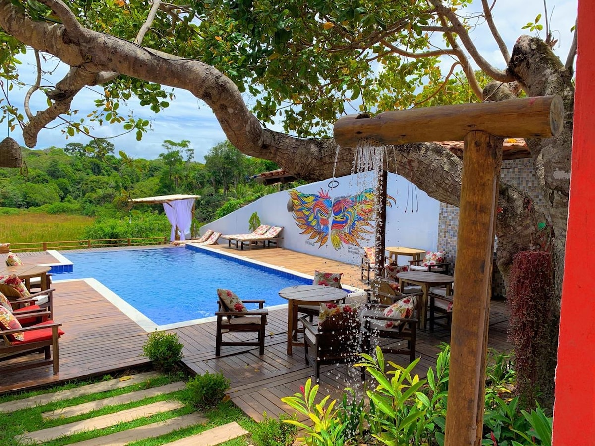 Բարի գալուստ իսկական դրախտ ։ Դուք ընտրել եք աշխարհի ամենագեղեցիկ վայրերից մեկը ։ Շալեն գրեթե շրջապատված է ջրով, որտեղից ֆանտաստիկ տեսարաններ են բացվում դեպի արգելոց ։ Կարող եք կայակը տանել արևադարձային անձրևային անտառ կամ անմիջապես դեպի ծով, որտեղ ձեզ սպասում է աշխարհի ամենագեղեցիկ լողափերից մեկը: Վայելեք կոկտեյլ մայրամուտին լողավազանում կամ լաունջը շալեի շրջակայքում գտնվող բազմաթիվ տախտակամածներից մեկում: Վայելեք աշխարհահռչակ Quadrado - ն, որը մոտակայքում է: Վայելեք Բրազիլիայի լավագույն առաջարկը: