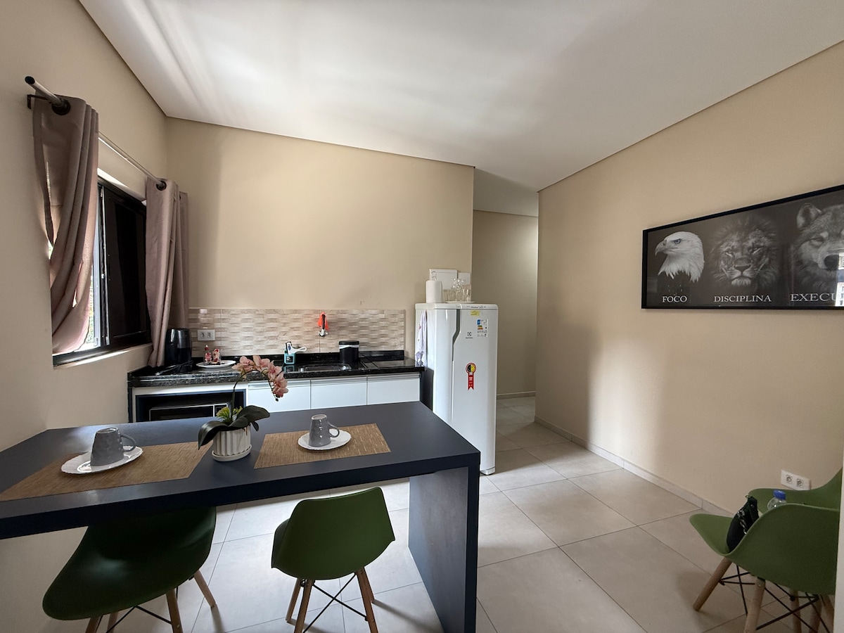 Բնակարանը ձևավորված և բաժանված է երկու սենյակի ՝ հյուրասենյակով և հանրակացարանով, 32մ ² մակերեսով ։ Բլոկը հագեցած է ամերիկյան խոհանոցով, որը պարունակում է էլեկտրական եփուկ, միկրոալիքային վառարան, մինիբար, Wi - Fi և աշխատանքային տարածք ։ Մենք ունենք սպասարկող կայանատեղի ։ Մենք գտնվում ենք Վիլա Օլիմպիայի բարդ թաղամասում, որտեղից հեշտությամբ կարելի է օգտվել այնպիսի հիմնական պողոտաներից, ինչպիսիք են Ֆարիա Լիման, Բանդեիրանտեսը և Լուիզ Կառլոս Բերրինին ։ Այն գտնվում է Կոնգոնհասի օդանավակայանից 5 կմ հեռավորության վրա և մոտ է Վիլա Օլիմպիա և JK առևտրի կենտրոններին ։