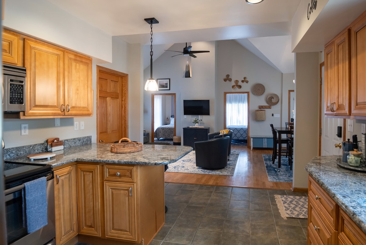 Gorgeous, open concept Main Street apartment on 3rd level, with views of downtown and partial views of the lake and harbor. New mini kitchen with 2 induction stove top burners, a microwave, toaster, and all the cookware and utensils needed for a getaway. Supersize custom island, comfy furnishings, and convenient to everything downtown. Unique building is connected to parking garage. Drive up to the 3rd floor - walk just 10 steps to your door - enjoy the views from above, without the climb.