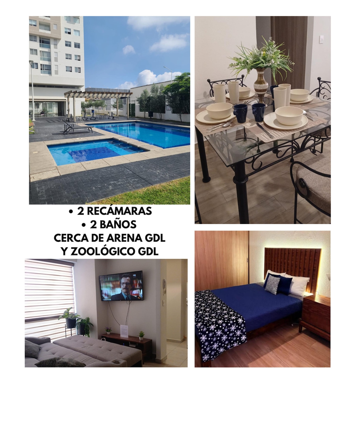 Departamento nuevo con Alberca y GYM cerca de Arena Guadalajara. Disfruta de una estancia cómoda y segura en este espacio acogedor, ideal para familias parejas o viajeros. Su ubicación y comodidades lo hacen perfecto también para estancias largas. Ubicado a solo 5 minutos de Arena Guadalajara y a 15 minutos del centro histórico, tendrás fácil acceso a eventos, conciertos, centros comerciales, y los principales atractivos turísticos de la ciudad. Tu próximo destino en Guadalajara te espera.