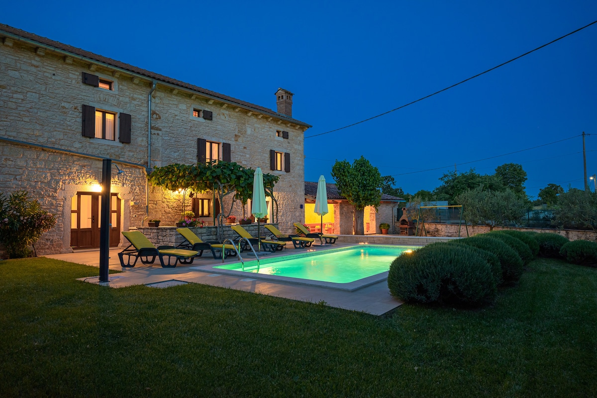 Նորաձև վիլլա Ռովինյի մոտակայքում՝ լուսանկարելու արժանի լողավազանով, ջակուզիով և սաունայով։ Արթնացեք հովիտի դեպի ծաղկուն, համայնապատկերային տեսարաններով։ Հարմար է զույգերի և ընտանիքների համար, մոտ է արկածային զբոսայգուն, Բրիյունի ազգային պարկին, դինոպարկին, միջնադարյան քաղաքներին և տեղական խոհանոցին։ Դա իսկական կանաչ փախուստ է բոլոր նրանց համար, ովքեր ցանկանում են վերադառնալ բնություն ՝ ժամանակակից կյանքի ամբողջ հարմարավետությամբ: Լիովին կահավորված է 2600 մ2 պարտեզում (ֆուտբոլ, արագության գնդակ, բադմինտոն և լողավազանի զվարճանք) խոհարարության և ժամանցի համար, որպեսզի ձեր երեխաները և սիրելիները վայելեն: