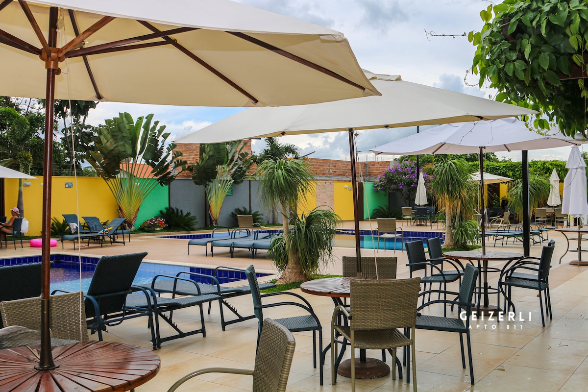 A apenas 2 km do centro da cidade, com vista privilegiada para as piscinas e área verde, no 1º andar. Nosso apartamento e localizado no 501, com Wi-Fi, Netflix e uma linda vista para a natureza. Com o shopping SINGAPURA a 500 metros Lazer: 8 amplas piscinas com águas termais, ofurôs, salão de jogos, salão de festas, bosque privativo e campo gramado.