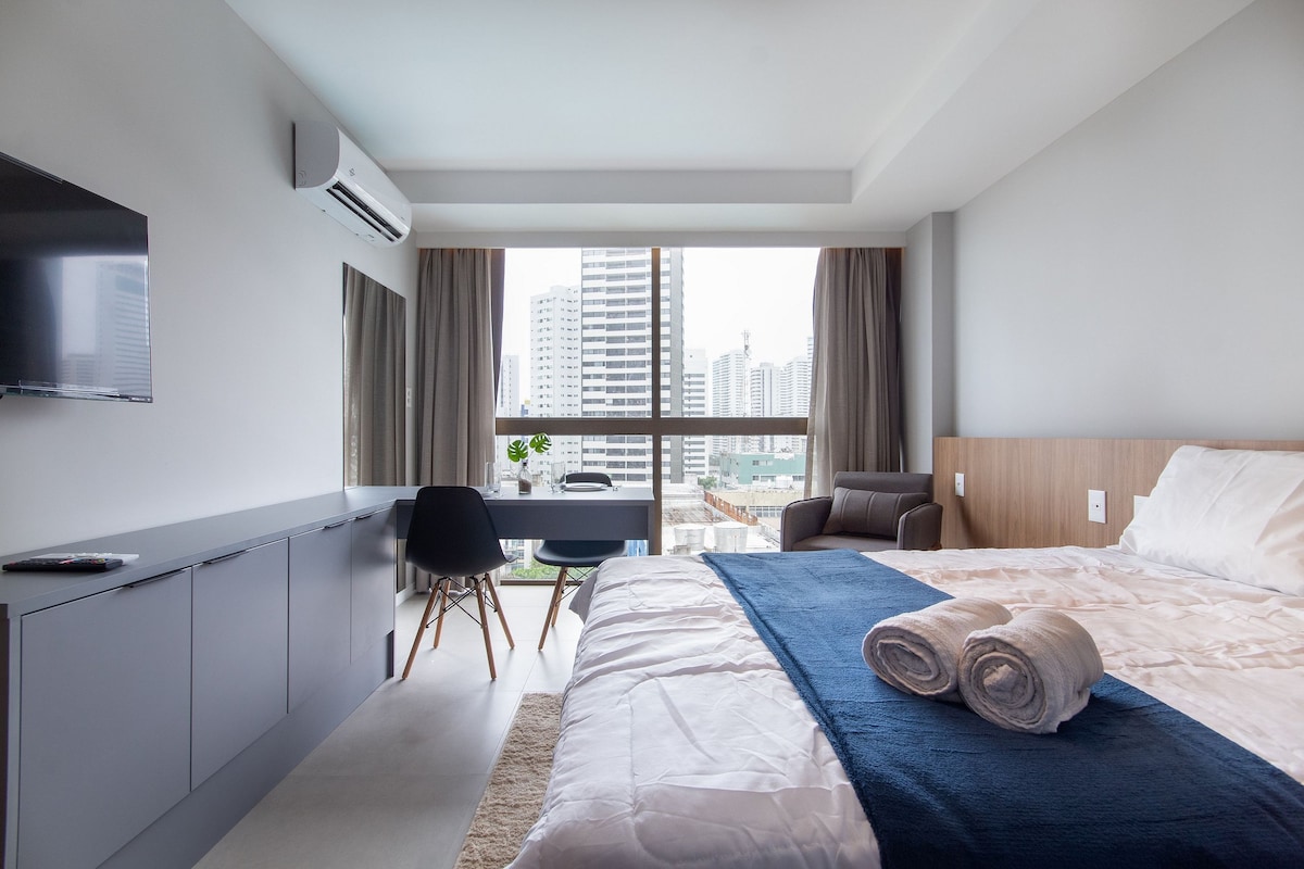 Այս յուրահատուկ վայրն ունի իր ոճը ։ Կատարյալ է նրանց համար, ովքեր պատրաստվում են աշխատել կամ մի քանի օր վայելել Ռեսիֆեում ։ Հիանալի դիրք, մոտ է լողափին, հիմնական առևտրի կենտրոններին, ռեստորաններին, հացթուխներին, սրճարաններին և այլն: Մեր բնակարանում կա հարմարավետ երկտեղանի մահճակալ և օժանդակ մահճակալ ։ Պրեմիում սպիտակեղեն ։ Հեռուստացույց 50 '։ Ինտերնետ ։ Լավ կահավորված խոհանոց. Հարմարավետ սեղան ճաշի կամ աշխատանքի համար։ Շենք ՝ կայանատեղիով, լվացքատունով, համագործակցությամբ, համադամասերական տարածքով, լողավազանով, մրրիկով, մարզասրահով ։
