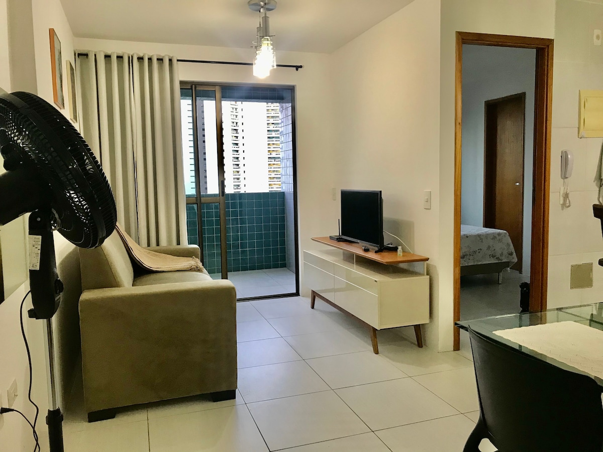 ⭐️⭐️⭐️⭐️⭐️Quarto e sala, esta em uma excelente localização de Boa Viagem, com cama de casal e um sofá cama, cooktop e microondas, 2 ar-cond (Split), 2 Smart Tv, wifi, armário, espelho, mesa de trabalho, mesa de jantar, utensílios e eletrônicos de cozinha, peças de cama e banho. Vaga de garagem, moveis planejados, salão fitness. Próximo ao Shopping Recife (5 min a pé), a praia (10 min a pé) e em frente ao Mix Matheus (Supermercado com utilitários). Academia, piscina, sauna e restaurante. Seguro