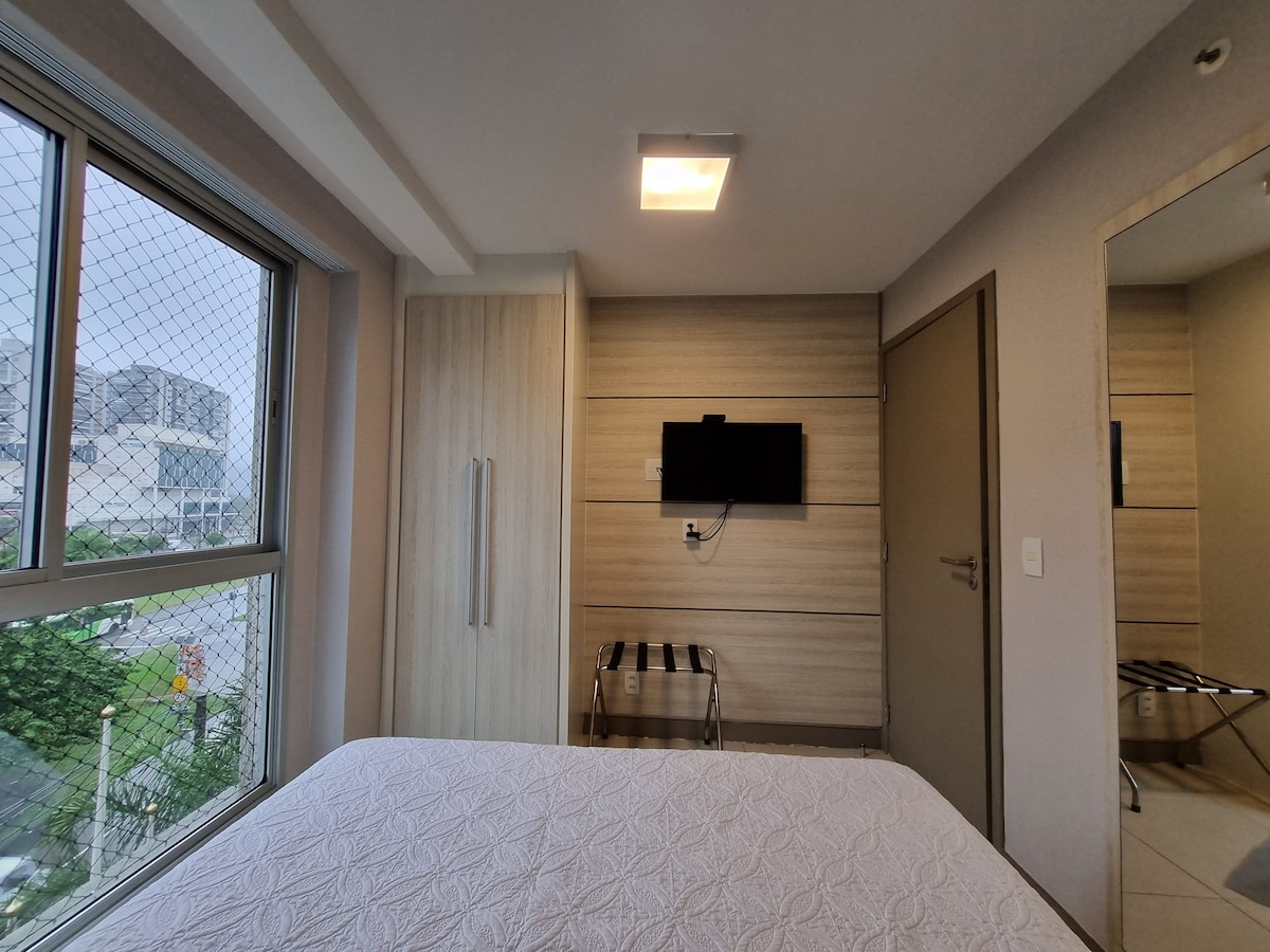 1 սենյականոց բնակարան Պրայա դու Պոնտալի եզրին ՝ Ռեկրեյո դոս Բանդեիրանտեսում, հյուրասենյակում և ննջասենյակում ՝ օդորակիչով ։ Առողջարանային ենթակառուցվածքով, Պոնտալ Ռոուդի տեսարանով, 4 հոգու համար նախատեսված կացարանով, 1 երկտեղանի մահճակալով և 1 երկտեղանի մահճակալով հյուրասենյակում, գերարագ Wi - Fi ։ ՍՄԱՐԹ հեռուստացույց հյուրասենյակում և ննջասենյակում Այն ունի ուղիղ մուտք դեպի լողափ, ջեռուցվող լողավազան, բացօթյա լողավազան ։ Վճարովի ռեստորան առանձին ՝ նախաճաշ, ճաշ և ընթրիք մատուցելով ։ Ճաշը գանձվում է կիլոգրամով ։