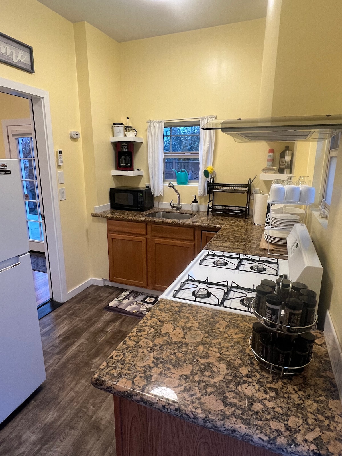 Վայելեք այս բունգալոյի ամբողջ հիմնական հարկը ՝ առանձին գլխավոր մուտքով, 2 ննջասենյակով և 1 լոգասենյակով, որը լի է բնական լույսով, փայտե հատակով, հարմարավետ հյուրասենյակով, որը բացվում է դեպի լիովին կահավորված խոհանոց և նախաճաշի հարմարավետ անկյուն ։ Սկսեք ձեր առավոտը առանձին տախտակամածի վրա սուրճով և օգտվեք բակի և այգու տարածքից ՝ հանգստանալու և մի բաժակ գինի վայելելու համար ։ Տան ներքևում կա իմ ընտանիքի օգտագործման համար նախատեսված բնակարան ՝ առանձին մուտքով ։ Լիցենզավորվել է Պորտլենդի քաղաքապետարանի կողմից