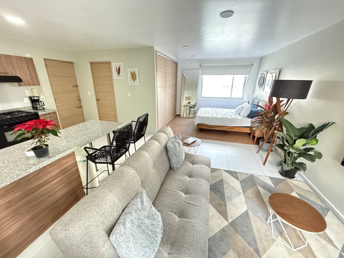 Ժամանակակից և պայծառ ստուդիա CDMX - ի ամենանշանավոր և աշխույժ թաղամասերից մեկի ՝ Ռոմա Նորտի սրտում ։ Նախատեսված է հարմարավետություն և ֆունկցիոնալություն առաջարկելու համար, իդեալական է կարճաժամկետ կամ երկարաժամկետ այցերի համար ։ Այն ունի երկտեղանի մահճակալ, զուգարան, կահավորված խոհանոց, ճաշասենյակ, հարմարավետ հյուրասենյակ, Սմարթ հեռուստացույց, արագ Wi - Fi, սրճեփ, ջրի զտիչ և անվճար ականջակալներ ։ Ռեստորաններին, սրճարաններին, զբոսայգիներին, պատկերասրահներին և տրանսպորտին մոտ: Կատարյալ է հանգստանալու, աշխատելու կամ քաղաքը ուսումնասիրելու համար ։