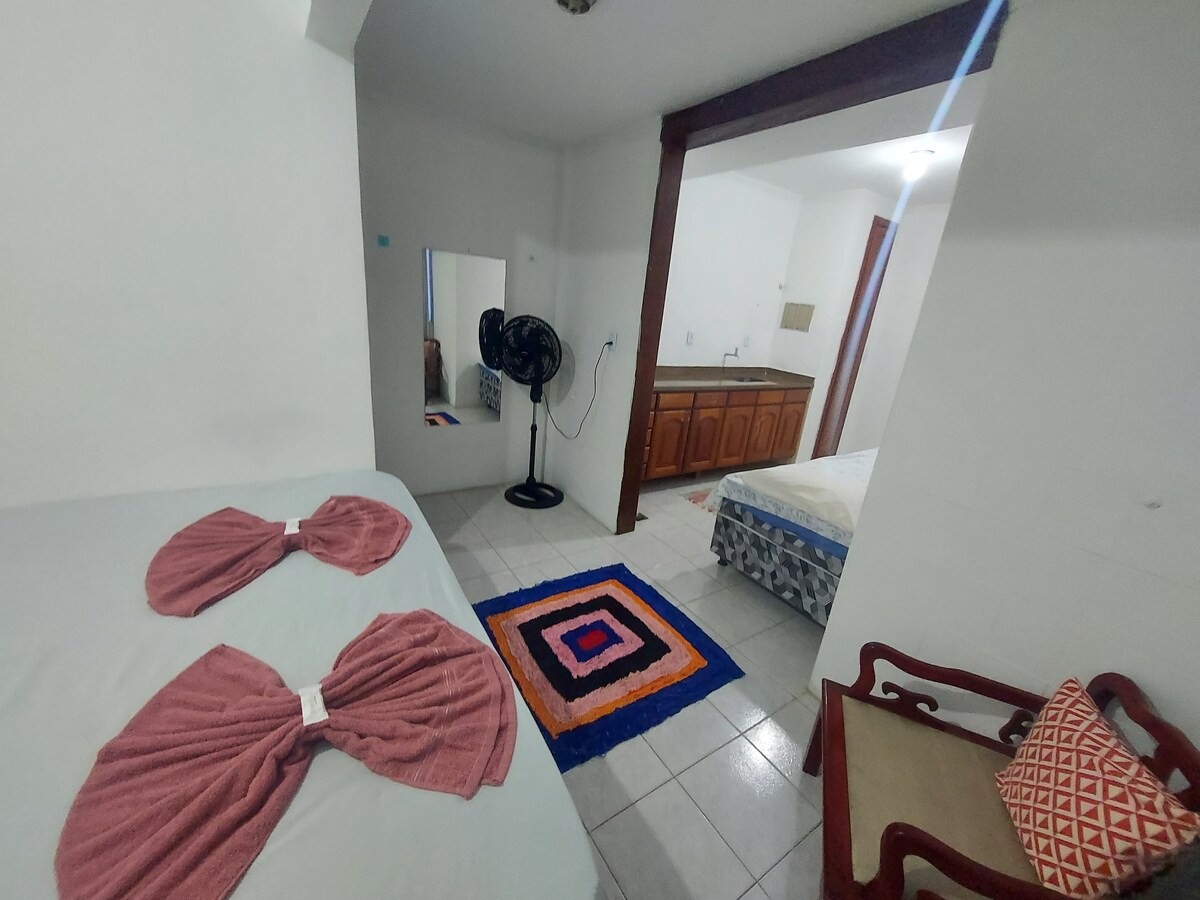 Apartamentos sem sala composto de quarto/cozinha/banheiro de uso PRIVATIVO com 1 vaga na garagem a 1,7 km da Praia do Peró e Conchas, 3 km da Ilha do Japonês, 7 km da Praia do Forte, 20 km de Búzios ou Arraial. Proximidades: Mercado, Padaria e Farmácia e fácil acesso a transportes, banco 24 horas. Janela para frente com cooktop de 2 bocas embutido na pia sem forno com Smart Tv de 32" e ar condicionado. Área de serviço e micro-ondas compartilhados! Wifi incluso