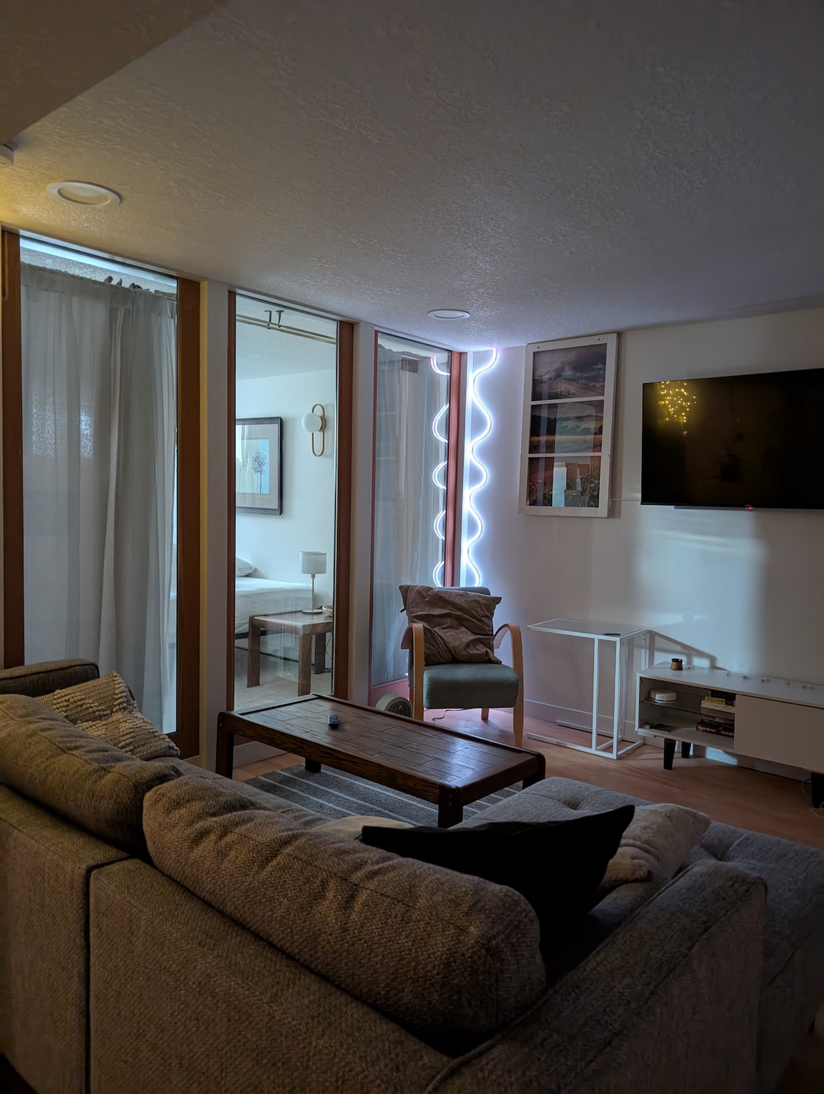 Note * There are stairs down to the suite. Sauna, pool table, jet tub. Relax in the infrared sauna or enjoy a soothing bath in the jet tub. Play a game of pool or relax on the leather furniture in front of the electric fireplace. The Smart 50" TV has Netflix and cable. Hi Speed internet at 134 mnbp RO filtered water on the fridge , the kitchen fully equipped. There is a wall mounted tv in the bedroom. A private outside yard has lounge chairs and a gas fire pit. Licence # STA005