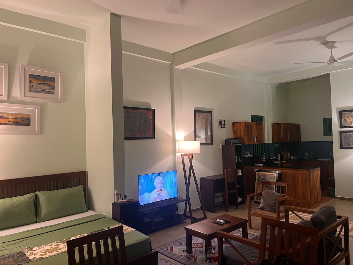 Kick back and relax in this calm, stylish Villa with Free breakfast and buttler provided free of charge in this colonial space with In house Spa facilities with a huge garden surrounded by peacocks with just a few steps to the Mawella beach in our own private road of just 100 meters and also provides breakfast if guest prefers for free with a permanent in house professional buttler.Sri Lanka Tourist Board Approved property. 15 minutes tuk tuk ride to HIRIKETIYA. 42'' Smart TV Available