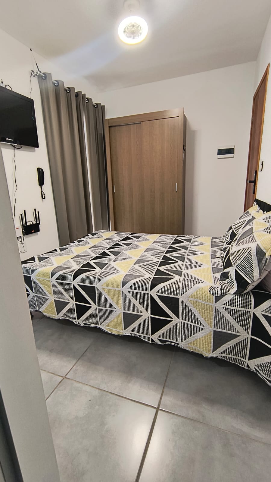 Apartamento moderno, elegante e bem planejado, perfeito para uma estadia confortável e acolhedora. Quarto aconchegante com cama de casal, roupa de cama, armários amplos, Wi-Fi, ventilador de teto e TV. Cozinha compacta, prática e equipada com armários, bancada, cafeteira, panela elétrica, airfryer, pratos e utensílios. Banheiro privativo com chuveiro elétrico e toalhas. Tem vista para a cidade, apreciada da mini sacada com persianas, garantindo mais privacidade e charme ao espaço.