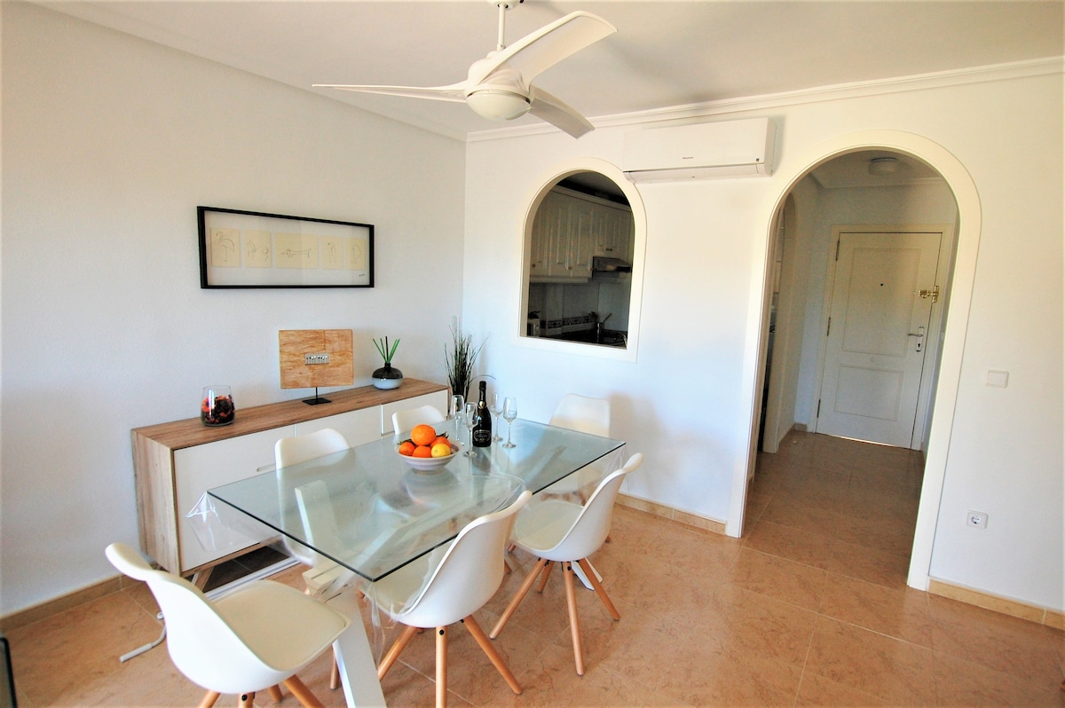 El lugar perfecto para relajarse. Modern,luminoso apartamento en una residencia nueva con varias zonas recreativas.Una piscina de 160m² y otra de 20m² para los niños, zonas distintas a juego petanca. El apartamento tiene 3 habitaciones y 2 baños. Completamente equipado hasta 6 personas. Dentro de 1 kilometro se encuentran varios bares,restaurantes y supermercado. Campo de golf a 2,5 kilómetros. Playas bonitas a 5-6 kilómetros. La Zenia Boulevard,el centro comercial muy conocido a 6 kilómetros.