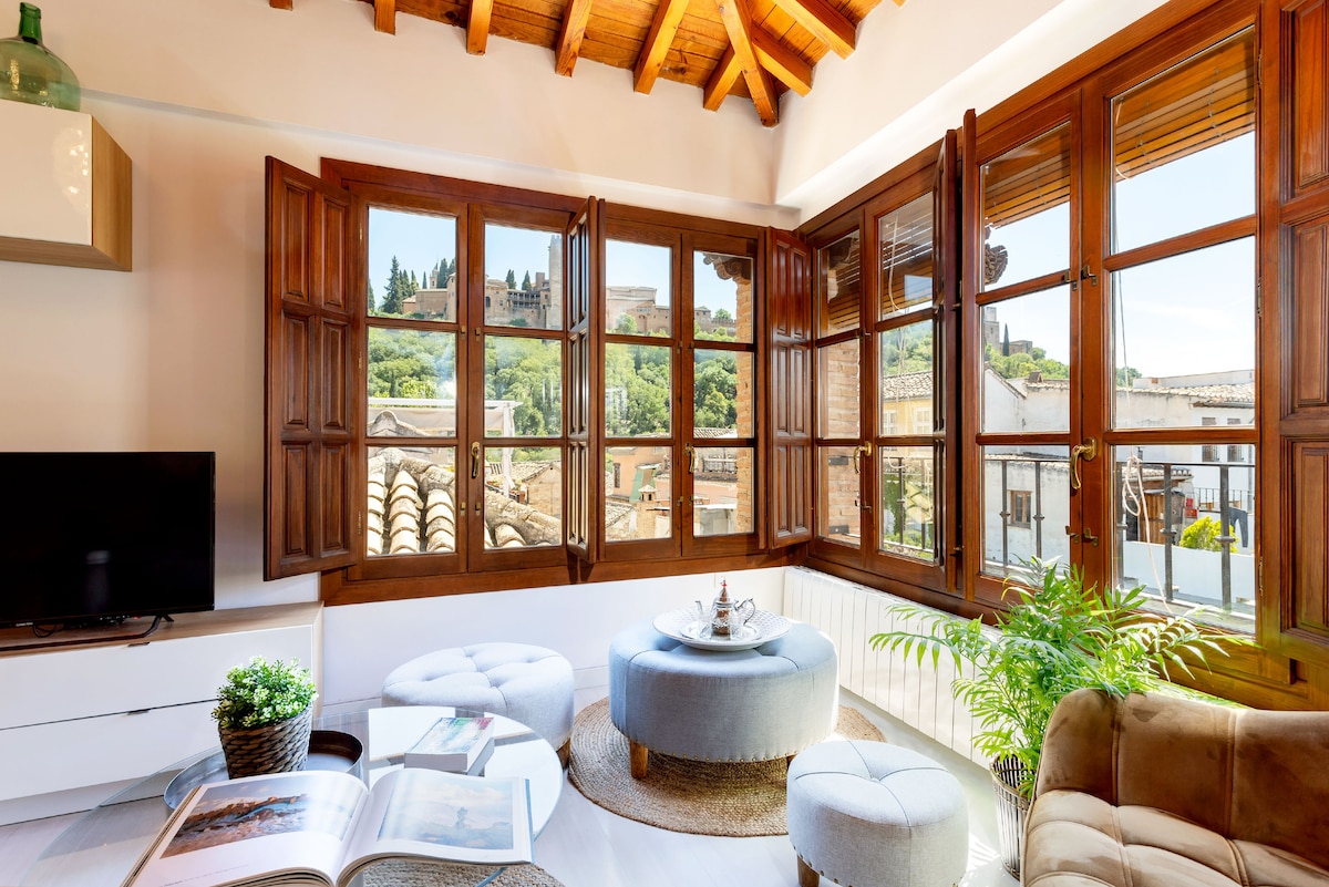 Անհավանական բնակարան Գրանադայի պատմական թաղամասում, որը կոչվում է Albaicín: Մահճակալից դուք կունենաք տպավորիչ տեսարաններ Alhambra, որ թվում է, որ դուք կարող եք դիպչել այն ձեր ձեռքերով... Հյուրասենյակից դուք կարող եք վայելել նույն սենսացիան: Գտնվում է անբացատրելի տարածքում, անմիջապես Ալհամբրայի դիմաց, որտեղից բացվում է այս տպավորիչ հուշարձանի լավագույն և ամենամոտ տեսարանները ։
