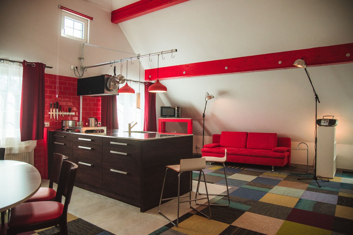 Մինչև 20 հոգու համար նախատեսված այս շքեղ խմբային կացարանը իրականում հյուրանոց է՝ հյուրասենյակով, ռեստորանով, վեց երկտեղանի սենյակով, 6+2 հոգու համար նախատեսված լոֆթով, պրոֆեսիոնալ խոհանոցով, բարով և պիցցայի անկյունով։ Իդեալական է ընտանիքների, ընկերների, խոհարարական ակումբների և ղեկավարների համար։ Կա հարմարավետ բակ, պատշգամբ, լողավազան՝ արևայրուք ընդունելու տարածքով և ճոճանակով։ Կարող եք մնալ այստեղ՝ ինքնուրույն սնվելով, և միշտ կա մեկը, որը կօգնի ձեզ։ Այն գեղեցիկ է դաշտերի, անտառների և բլուրների միջև ։