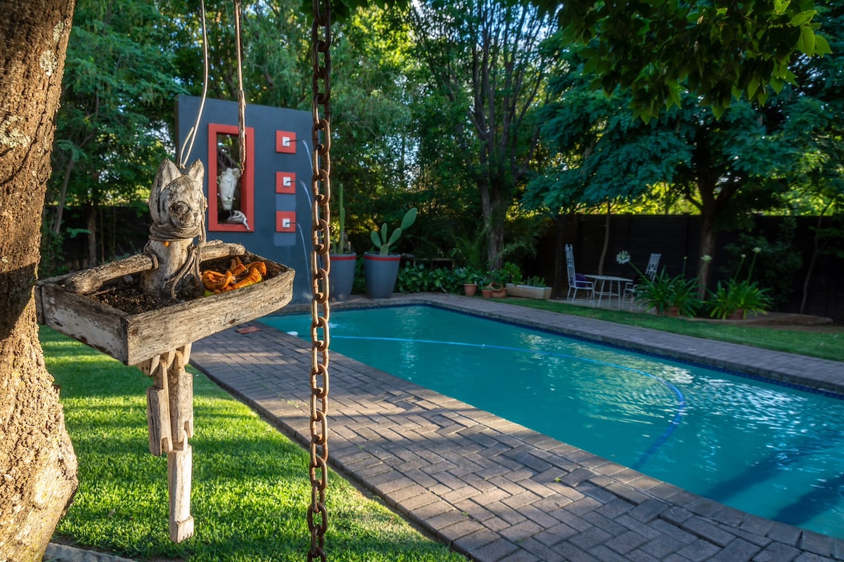 BUCHU, our spacious Family unit, will steal your heart with warmth and charm! Lounge with Fireplace, beautiful Diningroom, spacious Kitchen & 2 Bedrooms. Inverter backup, Egyptian Cotton Bedding, Aircons, Netflix & Wi-fi. Cozy outside Boma braai area.