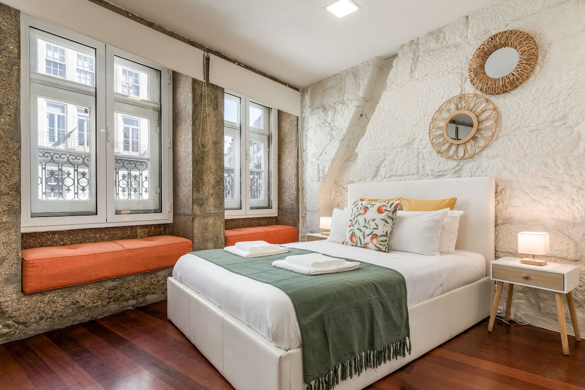 Բնակարան, որը գտնվում է Պորտու քաղաքի պատմական թաղամասի սրտում՝ հայտնի Ֆեռնանդինայի պատի հարևանությամբ։ Այն ունի ննջասենյակ՝ երկտեղանի մահճակալով, թախտ-մահճակալով և Դուորո գետի ու Սերա դու Պիլար վանքի հիանալի տեսարանով։ Այն ունի խոհանոցային տարածք ՝ հագեցած գազօջախով, ջեռոցով, միկրոալիքային վառարանով, սառնարանով և ամանալվաց մեքենայով ։ Այն ունի նաև նստելու տարածք՝ բազմոցով, հեռուստացույցով և ճաշասեղանով։ Անվճար Wi - Fi և կաբելային հեռուստատեսություն ։