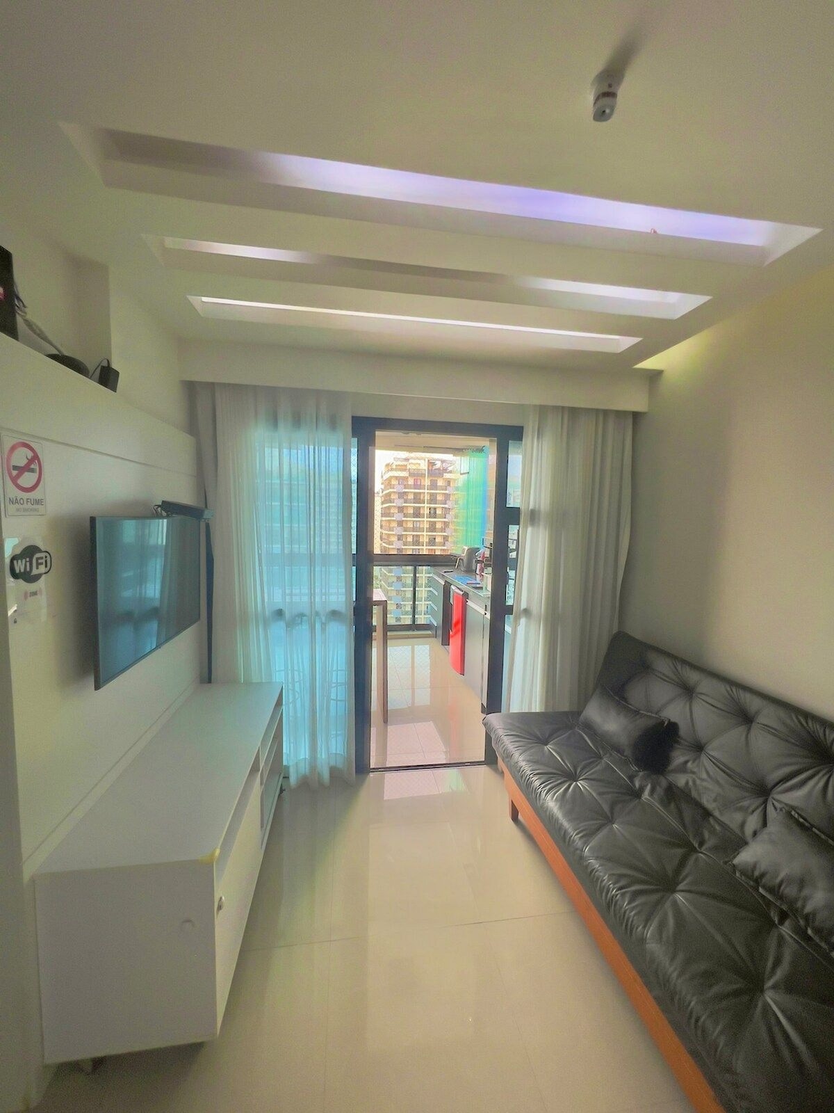 Amplo sala e quarto varanda, decorado, totalmente equipado Internet fibra optica alta velocidade, Wi-Fi, 2 smart tv's. na sala 55" no quarto 46", sala com ventilador de teto sofá cama, quarto cama de casal, ar condicionado split, agradavel escritorio impressora, cozinha americana geladeira,fogão, micro ondas, torradeira, liquidificador, máquina Nespresso, utensílios,secador de cabelos,máquina de lavar roupas,ferro e tabua de passar roupas,charmosa varanda com vista lateral da praia e piscina.