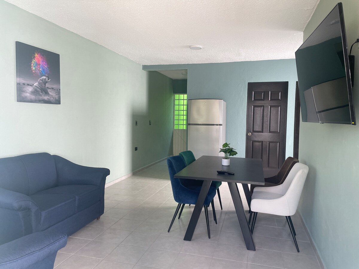 Բնակարան մինչև 6 հոգու համար, ավտոկայանատեղի 2 մեքենայի համար, առանձին, հսկողություն, անվտանգության տեսախցիկ, Wi - Fi, տաք ջուր ճնշմամբ, հյուրասենյակ, խոհանոց, 2 ննջասենյակ և 1 ուսումնասիրություն, որոնք կարելի է զբաղեցնել փչովի ներքնակով, օդորակիչով և օդափոխիչներով քնելու համար: Հեռուստացույց Netflix - ով: Գերազանց տեղադրություն, Oxxo, լրացուցիչ, դեղատուն, բենզալցակայան, Soriana San Joaquín և շատ հաստատություններ շատ մոտ: 1 րոպե արվարձաններից: