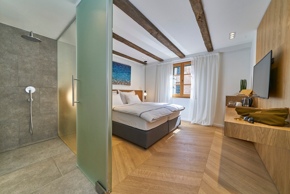 This room is air conditioned, equipped with smart TV, free WiFi, safety box and electronic door lock. You will also find an electronic kettle, nespresso machine and a fridge with some complimentary items. If you happen to visit Dream Luxury Rooms during the winter, or if you just do not like your feet cold, each of our bathrooms is equipped with underfloor heating. Special part of this room is city view ( view on ferry port and park Marjan).
