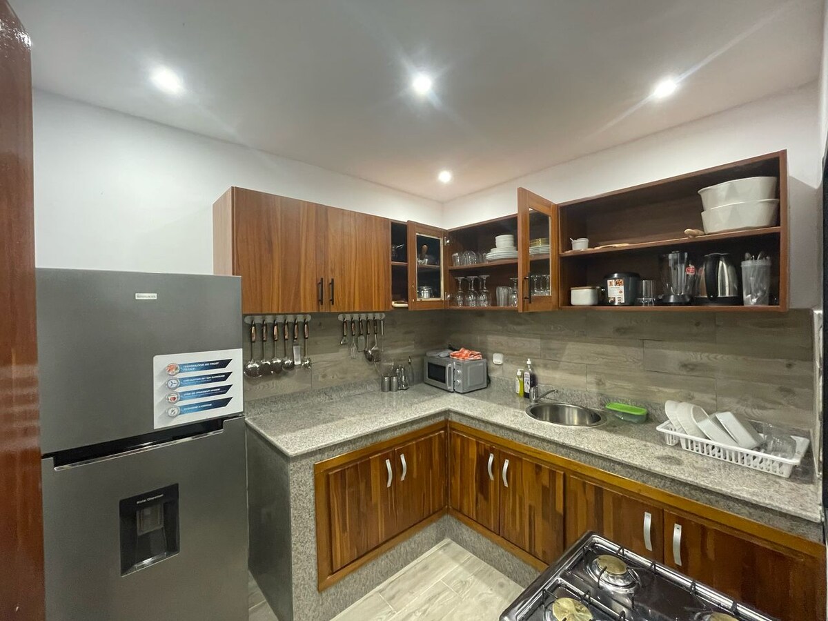 Մնացեք Աբիջանի սրտում՝ այս հոյակապ նոր, խաղաղ, ջերմ, բնական երանգներով և համեղ ձևավորված բնակարանում, որտեղ ժամանակակից մթնոլորտը նպաստում է հանգստին։ Այս ընդարձակ և լիովին առանձին բնակարանը գտնվում է հանգիստ և անվտանգ բնակելի շենքի 2-րդ հարկում և կատարյալ է գործնական այցի կամ հանգստի համար։ Կացարանը գտնվում է սարահարթից 25 րոպե հեռավորության վրա, օդանավակայանից 35 րոպե հեռավորության վրա և Աբիջան մոլից 10 րոպե հեռավորության վրա: Բազմաթիվ հարմարությունների մոտակայքում ։