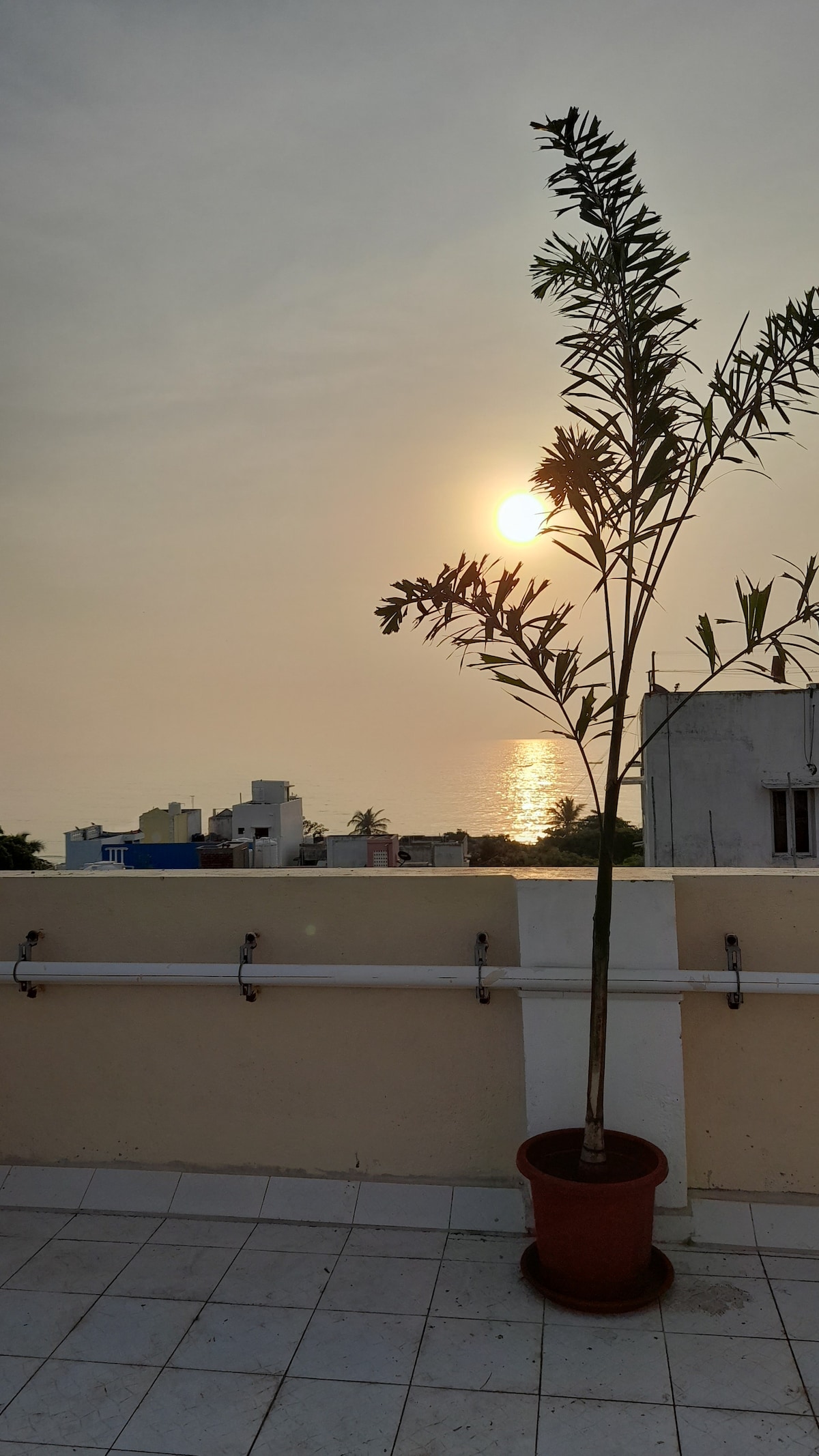 Եթե սիրում եք արևածագեր, վայելեք դրանք մեր կտուրից կամ կարճատև զբոսանք դեպի լողափ ։ Մեր սեփականությունը Գանդի Բիչի/Ռոք Բիչի և Ուայթ Թաունի մոտակայքում գտնվող լավագույն տներից է ։ Բնակարանը գտնվում է ծովափից 50 մետր հեռավորության վրա և Գանդիի արձանից, Շրի Աուրոբինդո Աշրամից և բազմաթիվ սրճարաններից ու ռեստորաններից մոտ 500 մետր հեռավորության վրա ։ Շրջագայելը հեշտ է մոտակայքում գտնվող ավտոմեքենաների, տաքսիների և սկուտերների միջոցով ։ Մենք տրամադրում ենք մեքենայի պաշտպանված կայանատեղի, իսկ առաջին հարկում գտնվելը հարմար է դարձնում հարկաբաժինը տարեց քաղաքացիների համար ։