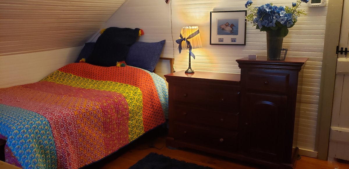 Բարի գալուստ ձեր մասնավոր վերևի ննջասենյակ ՝ իր առանձին մուտքով և լոգասենյակով ։ Այս հմայիչ արդյունավետությունն առաջարկում է երկտեղանի մահճակալ ՝ հանգիստ գիշերների համար, ինչպես նաև քնելու համար նախատեսված բազմոց, որը կատարյալ է մեծահասակի կամ երկու փոքր երեխաների համար ։ Վայելեք մինի սառնարանի, սրճեփի և միկրոալիքային վառարանի հարմարավետությունը ։ Դուրս եկեք ձեր դռնից դեպի մեր շքամուտքի նստած տարածքը ՝ մանղալով: Խելամտորեն ստեղծված լինելով և ՛ անձնական, և ՛ հրապուրիչ զգալու համար ։ Այն խաղաղ տարածք է ՝ ձեր այցի ընթացքում հանգստանալու, լիցքաթափվելու և ինչպես տանը զգալու համար ։